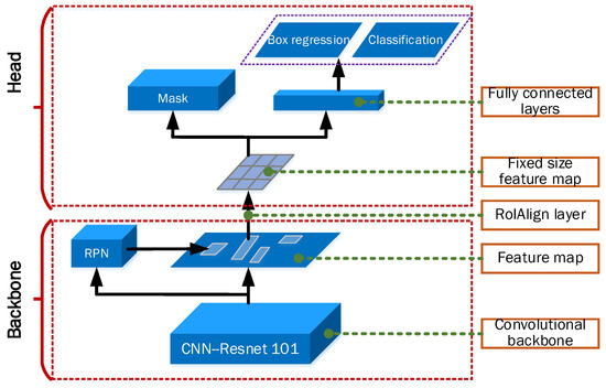 The model structure of Mask RCNN is shown in Figure 13. Mask RCNN is a small and flexible general-purpose object instance segmentation framework. It can not only detect the targets in the image, but also provide a high-quality segmentation result for each detected target. The whole network structure consists of two parts; one is Backbone for feature extraction, and the other is Head for classification, image regression prediction, and “mask” prediction for each ROI. In the backbone part, Mask RCNN uses Resnet101 as the backbone feature extraction network. The extracted four effective features are used to construct the Feature Pyramid Network (FPN). FPN can realize multi-scale fusion of feature maps extracted by backbone feature extraction network. Region Proposal Network (RPN) is used to help the network obtain the suggestion box. The suggestion box is to filter whether there is a defect target in which region of the image. RoIAlign is used to deal with the problem that the mask in the detection results is not aligned to the defect region in the original image. The head part classifies the ROI obtained by the network, predicts the image regression, and predicts the “mask”.