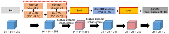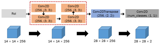 The defect segmentation is to separate the defect and the background to better identify the shape and position information of the defect. The running process and the number of layers of the segmentation model of Mask RCNN are shown in Figure 14. First, the feature map obtained from the RoIAlign layer is convoluted four times, and then the mask is obtained after the deconvolution operation. Finally, the number of channels in the mask is adjusted by convolution to match the number of target species. Although the Mask RCNN can recover the belonging category of pixels, its recognition ability for defect edges is poor. The reason for the detection is the reduced resolution and lost details after the deconvolution operation.