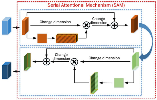 The attention mechanism can effectively improve the detection performance of deep networks. The purpose of introducing the attention mechanism in the model is to add weight values to each feature point of the feature layer, and to automatically enhance the original feature layer based on the weight of the feature points. Attention mechanisms include the channel attention mechanism [32] and the spatial attention mechanism [33]. The channel attention mechanism and the spatial attention mechanism only enhance the feature layer from a single perspective, ignoring several factors in the actual computation process. Therefore, this section proposes a Serial Attention Mechanism (SAM). SAM integrates the channel attention mechanisms and the spatial attention mechanisms to make them work serially together. Specifically, before deconvolution, the feature layer is first fed into the SAM for channel feature enhancement. After deconvolution, the feature layer is fed back into the SAM for feature recovery enhancement. Among them, the channel attention mechanism uses the correlation between the category features of different channels to perform feature reinforcement and improve the classification accuracy. The spatial attention mechanism can simulate the connection between different local features and promote the classification accuracy between features. The structure and operational process of SAM is shown in Figure 15. The running process and number of layers of the SAM-Mask RCNN instance segmentation model is shown in Figure 16.