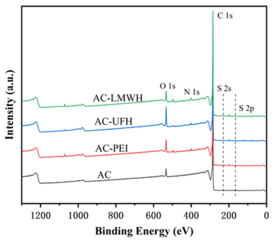 XPS spectra of AC, AC-PEI, AC-UFH, and AC-LMWH.