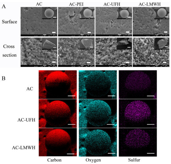 (A) SEM images of surface and cross-section of AC, AC-PEI, AC-UFH, and AC-LMWH (scale bar = 1 μm and scale bar of inserted images = 300 μm). (B) EDS mapping of AC, AC-UFH, and AC-LMWH; scale bar = 250 μm (red = carbon, light blue = oxygen, purple = sulfur).