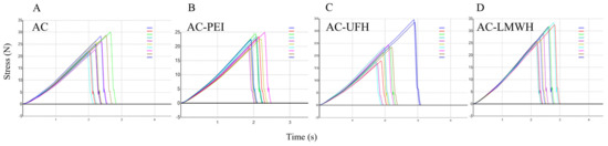 Texture curve of AC (A), AC-PEI (B), AC-UFH (C), and AC-LMWH (D) with 10 scans per sample. The line colors from top to bottom in the legend were the 1st scan to the 10th scan.