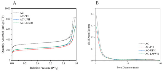 (A) Nitrogen adsorption–desorption isotherms and (B) pore size distribution curves of AC, AC-PEI, AC-UFH, and AC-LMWH.