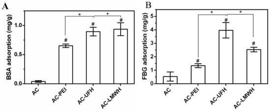 BSA (A) and FBG (B) adsorption capacity of absorbents. * p < 0.05, # p < 0.05 vs. AC.