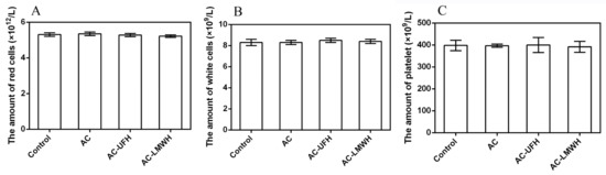 The loss of cell components in blood during the hemoperfusion was a problem that could not be ignored. In addition to high adsorption capacity, the ideal adsorbents for hemoperfusion also needed to have adsorption specificity and good biocompatibility to achieve less nonspecific adsorption of other blood components. In blood, blood cells account for about 45% of the blood volume, including red cells, white cells, and platelets. The main function of red cells is to transport oxygen. White blood cells mainly play the role of immunity. When bacteria invade the human body, white cells can pass through the capillary wall and are concentrated on the invasion site of the bacteria, surrounding the bacteria and swallowing them. Platelets play an important role in hemostasis. Figure 7 shows the amount of white cells, red cells, and platelets of blood incubated with AC, AC-UFH, and AC-LMWH. It could be seen that the amount of white cells, red cells, and platelets of AC, AC-UFH, and AC-LMWH had no significant difference from the control, indicating that AC, AC-UFH, and AC-LMWH had no significant effect on blood cell composition. This was attributed to the micropores of AC preventing blood cells from entering and being damaged.