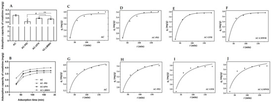 Further, the adsorption kinetics of the adsorbent were nonlinearly fitted by pseudo-first-order kinetics model and pseudo-second-order kinetics model according to the data of Figure 8B, as shown in Figure 8C–J. In addition, Table 6 presents the corresponding kinetic adsorption parameters calculated from the fitting equations. was the correlation coefficients, which represented the degree of fitting between kinetic adsorption curve and the model equation. The kinetic adsorption of AC was more in line with the pseudo-second-order kinetics model ( < ), and the kinetic adsorption of AC-UFH and AC-LMWH was more in line with the pseudo-first-order kinetics model ( > ), suggesting that the introduction of heparin resulted in more strong Van der Waals force between adsorbents and creatinine when compared with AC. Although the value of AC-UFH and AC-LMWH was lower than that of AC and AC-PEI, the obtained by fitting was higher than that of AC-PEI, once again proving that heparin immobilized on AC could enhance the adsorption capacity of creatinine through the intermolecular force.