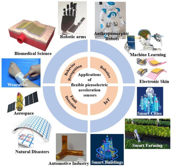 Flexible piezoelectric acceleration sensors are used in behavior recognition, robotics, fault monitoring, and the Internet of Things. Reprinted with permission from Ref. [15]. Copyright 2020, iScience. Image for “robotic arms”: Reprinted with permission from Ref. [16]. Copyright 2019, John Wiley and Sons. Image for “biomedical science”: Reprinted with permission from Ref. [17]. Copyright 2017, John Wiley and Sons. Image for “wearables”: Reprinted with permission from Ref. [18]. Copyright 2018, American Chemical Society. Image for “anthropomorphic robots”: Reprinted with permission from Ref. [19]. Copyright 2018, MDPI AG. Image for “machine learning”: Reprinted with permission from Ref. [20]. Copyright 2018, Elsevier. Image for “electronic skin”: Reprinted with permission from Ref. [21]. Copyright 2018, Elsevier. Image for “aerospace”: Reprinted with permission from Ref. [22]. Copyright 2017, Elsevier. Image for “natural disasters”: Reprinted with permission from Ref. [23]. Copyright 2021, American Chemical Society. Image for “automotive industry”: Reprinted with permission from Ref. [24]. Copyright 2021, Elsevier. Image for “Smart Cities”: Reproduced under the terms of the CC-BY Creative Commons Attribution 4.0 International license (https://www.freepik.com/free-vector/isometric-smart-city-background_4358967.htm (accessed on 4 November 2022)) [25]. Image for “Smart Farming”: Reproduced under the terms of the CC-BY Creative Commons Attribution 4.0 International license (https://www.freepik.com/free-photo/smart-robotic-farmers-concept-robot-farmers-agriculture-technology-farm-automation_21544365.htm (accessed on 27 February 2023)) [26]. Image for “Smart Buildings”: Reproduced under the terms of the CC-BY Creative Commons Attribution 4.0 International license (https://www.freepik.com/free-vector/isometric-smart-city-background_4358967.htm (accessed on 4 November 2022)) [27].