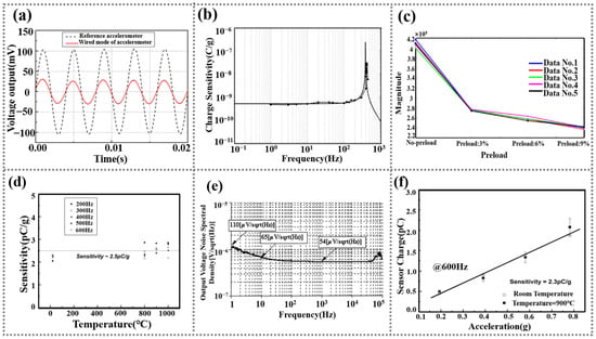 As shown in Figure 3a,b [44,45], the output voltage and sensitivity of the piezoelectric accelerometer are plotted against frequency, respectively. There is an inverse ratio between sensitivity and resonant frequency, and only at the expense of one parameter can the other be improved. If the sensor has a higher sensitivity, smaller changes in the measurement can be recognized. But a small interference in the measured object can lead to a significant change in the output of the sensor. When a small disturbance occurs, the signal is quickly amplified, which greatly affects the stability and detection range of the sensor. Therefore, by increasing the sensitivity, the accuracy of the detection can be improved, but this needs to be done within reasonable limits. Figure 3c [46] shows the sensitivity of the sensor measured at different preload torques. It can be seen that within a certain range of values, increasing the preload force appropriately improves the sensitivity of the sensor and its frequency response is smoother in the lower frequency bands, because if the preload force is appropriate, the contact stiffness and pre-strain of the element will improve, leading to an increase in the stress applied to the element, induced charge generation, and increased sensitivity. And once this threshold is exceeded, the sensitivity and frequency response performance of the system will decrease. This phenomenon may be due to the deformation of small bumps on the wafer surface beyond the elastic limit, plastic deformation, or cracking, which increases the contact area and reduces the contact stiffness, resulting in reduced sensitivity and poor stability of the frequency response [47]. In Figure 3d [48], the temperature gradually increases from 0 to 1000 °C and the frequency excitation increases from 200 to 600 Hz; the sensitivity of the sensor still fluctuates around a horizontal line, reflecting the good temperature stability of the sensor in a certain range. In Figure 3d, the temperature gradually increases from room temperature to 650 °C and the frequency excitation increases from 120 to 520 Hz; the sensitivity of the sensor still fluctuates around a horizontal line, reflecting the good temperature stability of the sensor in a certain range. Figure 3e [49] shows the output voltage noise spectral density of piezoelectric acceleration sensors. It can be seen that the main noise sources are the thermal noise of the bias resistor, and the input current and voltage noise of the operational amplifier at high frequencies [50]. Figure 3f [49] shows the output charge as a function of acceleration for the 600 Hz case. The figure shows that the charge sensitivity is 2.3 pC/g at both room temperature and 900 °C, with a deviation at 900 °C because more noise disturbances are introduced at this time compared to room temperature.