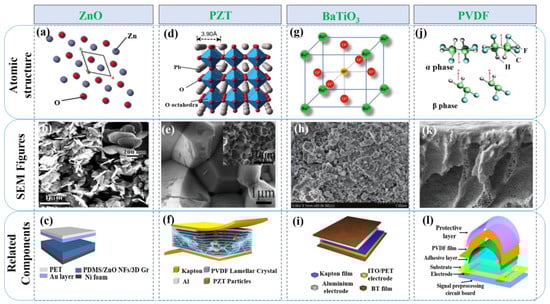 (a–c) Atomic structures, SEM images, and related components of ZnO, respectively. Reprinted with permission from Ref. [64]. Copyright 2019, Elsevier. Reprinted with permission from Ref. [65]. Copyright 2009, American Chemical Society. Reprinted with permission from Ref. [66]. Copyright 2018, American Chemical Society. (d–f) Atomic structures, SEM images, and related components of PZT, respectively. Reprinted with permission from Ref. [68]. Copyright 2012, Elsevier. Reprinted with permission from Ref. [68]. Copyright 2015, Elsevier. Reprinted with permission from Ref. [69]. Copyright 2019, Elsevier. (g–i) Atomic structures, SEM images, and related components of BaTiO3, respectively. Reprinted with permission from Ref. [70]. Copyright 2022, John Wiley and Sons. Reprinted with permission from Ref. [71]. Copyright 2011, American Chemical Society. Reprinted with permission from Ref. [72]. Copyright 2014, Elsevier. (j–l) Atomic structures, SEM images, and related components of PVDF, respectively. Reprinted with permission from Ref. [73]. Copyright 2012, Elsevier. Reprinted with permission from Ref. [74]. Copyright 2014, Elsevier. Reprinted with permission from Ref. [75]. Copyright 2020, MDPI AG.