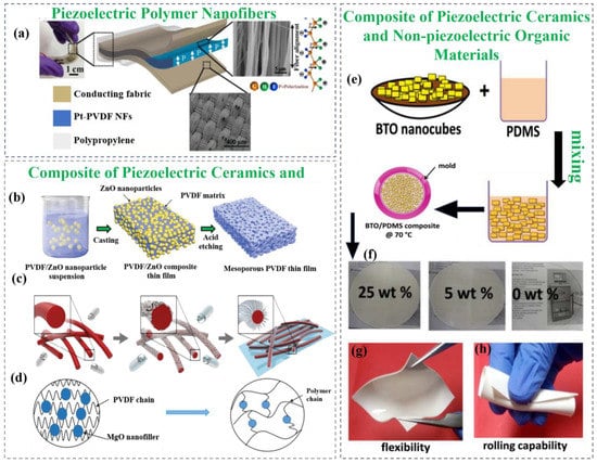 To sum up, there is an urgent need to explore and design materials with high voltage and high flexibility to fabricate piezoelectric acceleration sensors [76]. It was found that piezoelectric polymers such as PVDF and PVDF-TrFE can be used for the preparation of current flexible piezoelectric acceleration sensors. The preparation methods are divided into two types: One is to directly prepare piezoelectric polymers into nanofibers by electrospinning and other technologies. For example, piezoelectric polymers can be processed into PVDF-TrFE nanofibers. Ghosh et al. realized the preparation of this material, finding good softness and air permeability of this material (see Figure 5a) [77]. Another example is that inorganic piezoelectric materials are compounded with flexible polymers as nano-fillers, and then after micro-processing, flexible piezoelectric sensors can be fabricated [78]. Ceramic/polymer composites were first proposed in 1978, in which electrical properties have been greatly improved and are expected to exhibit some new properties [79,80]. Inorganic materials in the material will be very sensitive to applied forces due to high voltage [81,82]. In addition, due to the high elasticity of the elastic matrix in the composite, they also have good shape preservation and flexibility. Common inorganic piezoelectric materials include LiNbO3, PbTiO3 nanowires, PbTiO3 nanoparticles, etc. Elastic matrix is divided into non-piezoelectric organic materials and piezoelectric organic materials, and the former mainly include polydimethylsiloxane (PDMS), polyvinyl alcohol (PVA), and polystyrene (PS). Figure 5b–d show the composite process of piezoelectric ceramics and piezoelectric organic materials, among which Figure 5b shows the overall composite process [83] and Figure 5c [84] shows the change in material microstructure during the composite process, and Figure 5d [85] further shows the networking situation of piezoelectric ceramic particles in piezoelectric organic materials of PVDF. The composite of piezoelectric ceramics and non-piezoelectric organic materials is shown in Figure 5e–h [86]. Alluri et al. synthesized a flexible film of BaTiO3 and PDMS. Finally, they found that the film had good flexibility and rolling ability. This is because PDMS is chemically stable, highly insulating, inexpensive, corrosion-resistant, resistant to high and low temperatures, has good dielectric properties, is highly elastic, and has a high recovery force. It is cross-linked into a film by a polydimethylsiloxane curing agent [87] and can be stretched to 300% of its original length [88].