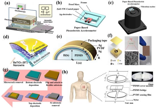 Materials for flexible piezoelectric acceleration sensors: (a) Microscopic morphology of PVDF-TERE nanofiber. Reprinted with permission from Ref. [77]. Copyright 2018, Elsevier. (b–d) The process of piezoelectric ceramics is compounded with piezoelectric organic materials. Reprinted with permission from Ref. [83]. Copyright 2014, John Wiley and Sons. Reprinted with permission from Ref. [84]. Copyright 2020, Elsevier. Reprinted with permission from Ref. [85]. Copyright 2019, Hindawi. (e,f) Composite process of piezoelectric ceramics and non-piezoelectric organic materials and its high flexibility (g) and high rolling capability (h). Reprinted with permission from Ref. [86]. Copyright 2017, American Chemical Society.