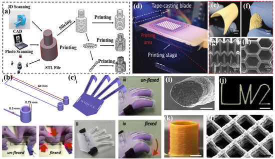 The whole process of 3D printing technology is shown in Figure 6 [101]: First, a model of the object to be printed is created using software such as Solidworks. Once the 3D model is created, it is then converted into an STL file, which stores all the information about the details of the model. The 3D printer obtains a series of 2D cross-sectional layers by splitting in the Z-direction. Finally, the desired object is printed layer by layer. Taking the printed flexible sensor and “glove” as examples, Figure 7(bi) shows the CAD design of the flexible sensor. Figure 7(bii) and Figure 7(biii) show the un-flexed and flexed states of the sensor, respectively. Figure 7(ci) and Figure 7(cii), respectively, show the CAD design of “gloves” and the finished product after printing. Figure 7(ciii) and Figure 7(civ), respectively, show the printed “gloves” in two states: un-flexed and flexed [102]. The piezoelectric nanocomposites were printed using 3D printing technology and the device used was a custom PuSL fabrication system, as shown in Figure 7d. As seen in Figure 7e–h, the printed piezoelectric nanocomposites have a fine surface structure and excellent surface finish [103]. Bodkhe et al. reasonably adjusted the nozzle size, pressure, and solution concentration to obtain 1D, 2D, 2.5D, and 3D shapes of PVDF, as shown in Figure 7i–l [104].