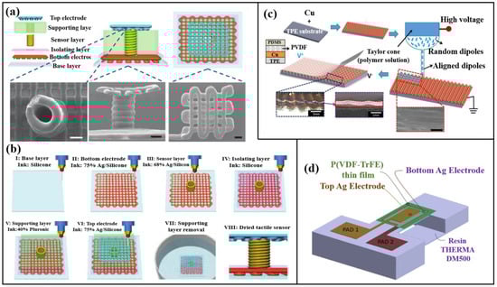 Figure 9a shows the design of a flexible tactile sensor proposed by Guo et al. [137]. The design develops a non-sintered ink with electrical conductivity and adjustable viscosity. Using a multi-material, multi-scale, and multi-functional 3D printing method, the designed sensor shows good linear current–voltage characteristics (see Figure 9b for the detailed process flow). Figure 9c [138] shows a piezoelectric pressure sensor fabricated by Fuh et al. The sensor substrate was fabricated by an FDM process and has a wavy shape. A layer of copper foil was placed on the substrate, and the piezoelectric composite PVDF was deposited on top of it by electrospinning. Finally, the sensor was encapsulated using PDMS film. Figure 9d [139] shows a functional acceleration sensor for piezoelectric signal readout. Bernasconi et al. combined 3D printing and inkjet material deposition intelligently to create a PVDF-TrFE piezoelectric layer and corresponding silver electrode. At the same time, stereolithographic techniques were selected to fabricate the structural components of the accelerometer. The results show that the proposed hybrid additive manufacturing technique is very promising for the mesoscale manufacture of electromechanical sensors.