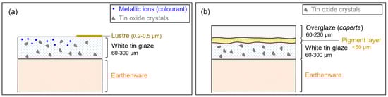 Schematic representation of two typical layer structures of Italian maiolica (thickness ranges taken from [4,5]). (a) Blue glaze and golden luster decoration: the earthenware body is covered by a white tin glaze; a blue colorant is fused into the glaze on the left side, while a luster decoration is applied over the white glaze on the right side. (b) Yellow decoration: the earthenware body is covered by a white tin glaze, a pigment layer, and a transparent overglaze (‘coperta’).