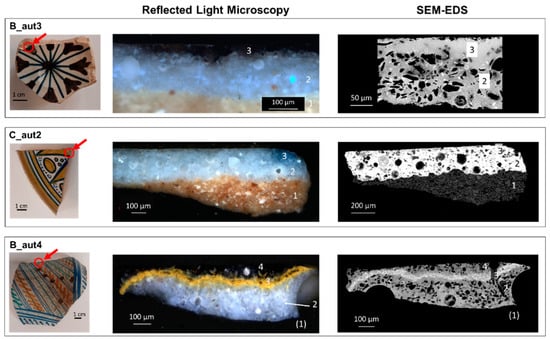 Figure 2 shows the macroscopic pictures of the sherds and the microscopic images (RLM and SEM-EDS) of the analyzed cross sections. Table 1 summarizes the samples information and their stratigraphy as provided by the SEM-EDS analysis.