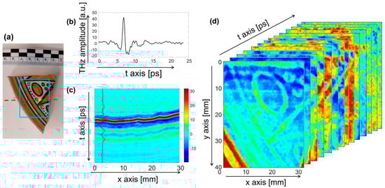 THz-TD imaging is based on the emission of a picosecond-short pulse, i.e., a THz pulse, which impinges on the sample under test (e.g., the sherd in Figure 3a) and interacts with it. Back-reflected pulses, or reflections, produced by the sample surface and each further inner interface occurring between materials with different refraction indexes are detected and stored as a function of the time-of-flight (ToF), i.e., the time that the signal employs to propagate from the emitter to the material interface and to return to the receiver (Figure 3b). The first reflection occurring in time is due to the interface between the air and the outer surface of the sample (i.e., the sample side close to the THz probes, which in this case is the outer glaze); subsequent pulses correspond to inner material interfaces. Therefore, the THz waveform collected from a single point accounts for the depth profile of the sample in that point, while a bi-dimensional cross-sectional image (also called B-scan or radargram) is obtained by collecting data, i.e., THz waveforms along a line (Figure 3c). Finally, the scan of an area generates a data cube (Figure 3d), from which different representations of the sample can be extrapolated, such as cross-sectional images along different lines, slices at different depths, and pseudo color 2D images (more details are provided in Section 3.4).