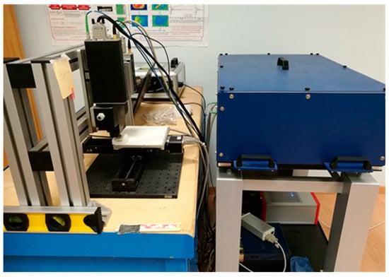 The maiolica sherds were analyzed by using the Zomega Fiber-Coupled Terahertz (FiCO) system (Zomega Terahertz Corp., New York, NY, USA) installed at the Institute of Electromagnetic Sensing of the Environment, National Research Council of Italy. The system is shown in Figure 4 and described in detail in [55]. FiCO is a Time-Domain System (TDS) made up of three main components: (a) The 1.5 µm laser source with an average power higher than 200 mW; (b) the base unit, which splits the source optical signal into the pump and probe beam used for THz waves generation and detection; (c) the transmitting and receiving modules, which are coupled with fiber optic and are reconfigurable in transmission and reflection mode. The laser source and the base unit are mounted on a movable optical table, optically connected to each other, and covered by means of an aluminum box, which protects the optical alignment and ensures operator safety with respect to the laser ray. The system is equipped with an imaging module, which allows for measurements in normal reflection mode on a planar area, whose maximum size is 150 mm × 150 mm. The transmitting and receiving modules are obtained in a fixed position and manually moved at the focal distance from the sample. The sample is placed on top of the automatic planar scanner and it is moved in both spatial directions with a minimum spatial offset of 0.12 mm.