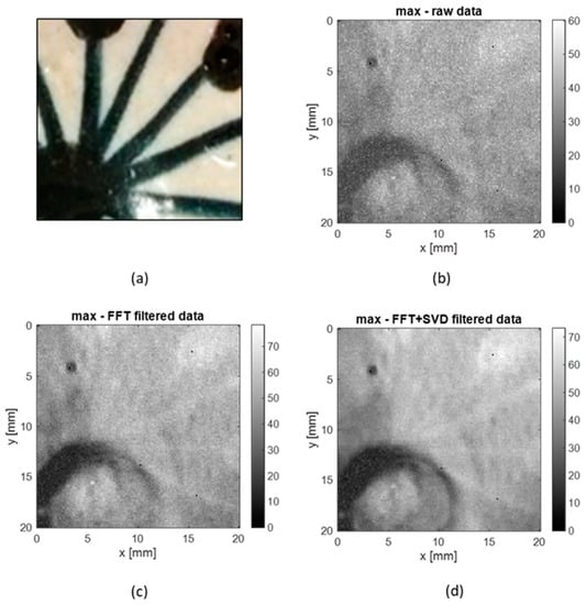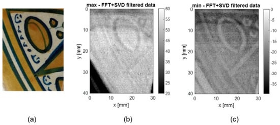 As already mentioned, sample Baut3 is a fragment from the base of a bowl; it has a depression, surrounded by a radial decoration of small tulips with blue stems and brown flowers. An area of 20 × 20 mm2, with the depression in the bottom left corner, was scanned by THz-TDI with a spatial offset of 0.15 mm (Figure 5a). Figure 5b–d show the THz pseudo color images obtained by plotting the maximum amplitude value of the raw, FFT filtered, and FFT + SVD filtered waveform collected at each measurement point, respectively. The comparison of the THz images makes clear the effect of the filtering procedures and corroborates their effectiveness as a tool to improve the readability of the THz images and to make the extrapolation of useful information easier. Stems and flowers are, indeed, roughly visible in Figure 5b, become clear in Figure 5c, and are better visualized in Figure 5d.