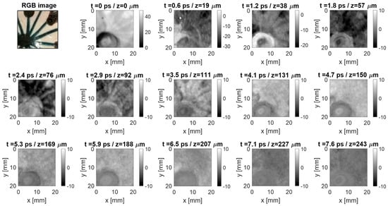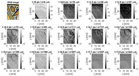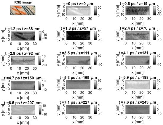 Pseudo color images have been obtained by plotting in each pixel the maximum, the minimum, or the total value of the amplitude of the filtered signal with m = 1, …, M. The amplitude values are given by the THz system in arbitrary units and are shown in the pseudo color images below using a gray scale. These images provide 2D visualizations of the sample related to its reflectivity map; therefore, they allow for the detection of materials with different refractive indexes. However, they do not account for depth information, and thus are not suitable to perform a stratigraphic characterization.