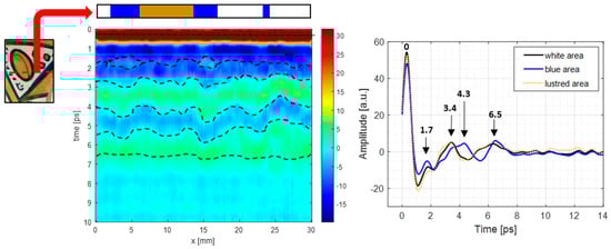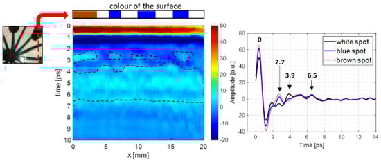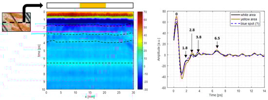 To corroborate the information about the sample stratigraphy, the B-scans have been also considered. For the sake of brevity, only a representative B-scan is shown in Figure 7 along with the THz waveforms referred to as white, blue, and brown spots. As stated, the first strong reflection is due to the interface between the air and the sample surface, and it is more intense in the colored regions. Further reflections occur at t = 2.7 ps, 3.9 ps, and 6.5 ps. The reflection at t = 3.9 ps is relevant in the waveform referred to the white point, while that at t = 2.7 ps is distinctively high in the colored areas (both blue and brown ones). Finally, the reflection at t = 6.5 ps is attributable to the interface between the glaze and the ceramic body.