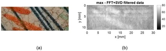 Sherd Baut3. (a) RGB picture of the area analyzed by THz-TDI; (b) THz maximum amplitude image of the FFT + SVD filtered data. The gray scale is in arbitrary units.