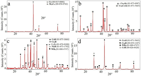 XRD patterns of (a) untreated, (b) aluminized, (c) boronized, and (d) boro-aluminized Haynes 25 samples.