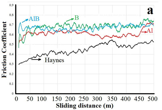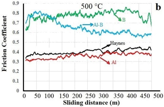 In Figure 7a, the untreated Haynes 25 alloy exhibits a lower friction coefficient than the thermochemically coated samples. However, the friction coefficient continuously increases as the sliding distance increases. This is due to the untreated alloy’s lower surface hardness, leading to increased contact area as the abrasive ball sinks into the substrate. The coated samples initially show similar friction coefficient trends with each other. Then, the boronized and boro-aluminized samples maintain a stable friction coefficient of around 0.65, while the aluminized sample exhibits a decrease within the range of 250–450 m sliding distance, followed by an increase between 450 and 500 m. The higher friction coefficient in the boronized and boro-aluminized samples is attributed to the hardness of the boride phases, which provide excellent wear resistance, as mentioned in a previous study [28]. In Figure 7b, the untreated Haynes 25 alloy and the aluminized sample show a stable trend with a friction coefficient of approximately 0.4 throughout the high-temperature wear test. This indicates a lower friction coefficient compared to that at room temperature, possibly due to sample softening caused by the high temperature and preheating process. The boronized and boro-aluminized samples, however, exhibit higher friction coefficient trends at high temperature. This can be attributed to the stability of boride phases, such as CoB, at elevated temperatures and the oxidation of these phases during the open-air wear tests at 500 °C. The oxidized compounds possibly acted as abrasive particles, leading to a higher friction coefficient [29,30].