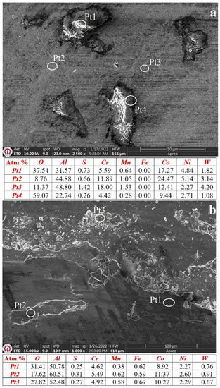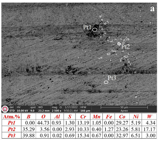 When examining the gray and black regions in Figure 8a, it is evident that the oxidation rate is increased, particularly in the black areas. Additionally, the presence of extruded wear debris on the surface and the clear visibility of microgrooves can be observed. It is understood that the wear debris on the surface is the cause of these groove formations. This can be attributed to the as-machined Haynes 25 alloy having a low surface hardness, resulting in less resistance against the abrasive ball and severe plastic deformation [37]. EDS analyses conducted on this sample indicate that in the black regions (Figure 8a (Pt2 and Pt3)), where the damage is greater, the oxygen content ranges from 36% to 40%. This suggests that the oxides formed on the surface are broken during the wear process and serve as abrasives. On the other hand, a dark-colored continuous plastered layer and white fractured region are seen in some areas on Figure 8b. It can be said that an oxidation-type wear mechanism occurs in the black regions of the sample [17,38]. The EDS analysis shows an increase in the oxide content. Oxygen contents ranging from 46% to 52% are observed in the spot analyses from Figure 8b, higher than those seen in the sample worn at room temperature (Figure 8a). In this region, the forces in the surface interaction sections against the ball are not sufficient to press the oxidation by-products, resulting in the accumulation of wear debris and the formation of relatively less worn surface areas, possibly due to the effect of centrifugal force.