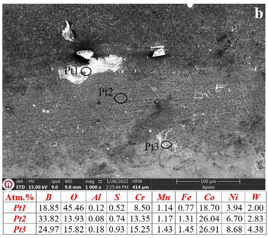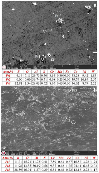 Figure 11 shows that the boro-aluminized sample has a worn surface appearance similar to the boronized sample tested at room temperature. However, there are more wear debris particles on the boro-aluminized sample. This is likely due to the presence of both boride and aluminide phases in the structure, which respond differently to the applied load. The EDS analysis confirms that the wear debris contains aluminum in one region (Pt2) and both boron and aluminum in other regions (Pt1 and Pt3). The erosion of the soft aluminide phases compared to the hard boron phases results in cavity formation on the surface, leading to slightly lower wear resistance for the boro-aluminized sample at room temperature. At elevated temperatures, a change in the wear mechanism occurs. Dark regions in Figure 11b indicate a higher oxide content. These oxide layers extrude and detach from the weaker edge regions, transforming into wear particles. The deposition of these particles (B2O3) on the surface provides a lubricating effect, as indicated by the decrease in the friction coefficient with increasing sliding distance [41]. The presence of boron and the retarding effect of aluminum on oxidation contribute to the superior wear resistance of the boron-aluminized sample in high-temperature wear tests [42]. However, detached particles cause abrasion and scratches on certain surface areas. EDS analysis shows lower aluminum ratios compared to pre-wear samples, indicating the greater impact of the high-temperature wear process on the aluminum phases in the coating.