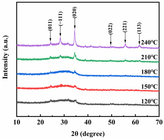 The structure of the film was measured using an X-ray diffractometer of the SmartLab model produced by Rigaku. The XRD results of HfO2 films deposited at different temperatures are shown in Figure 2. When the temperature is lower than 180 °C, no obvious diffraction peak appears, indicating that the film is amorphous. As the temperature further increases, the diffraction peaks intensity of the HfO2 film gradually increase, indicating that the film gradually changes from amorphous to crystalline, and the film exhibits a preferred crystal orientation at the (020) diffraction peak with a diffraction angle of 34.6° and the (−111) diffraction peak with a diffraction angle of 28.3°.