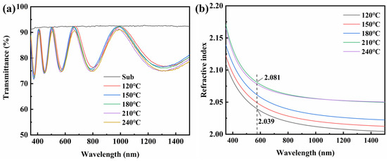 (a) Transmittance and (b) refractive index curves of HfO2 films at different substrate temperatures.
