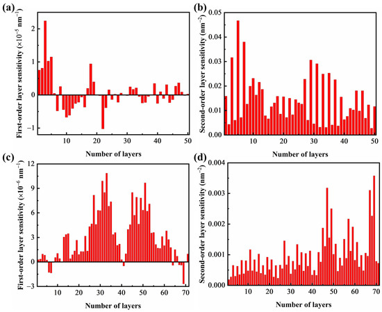 (a) First-order and (b) second-order layer sensitivity distribution diagram of the resonant cavity film A; (c) First-order and (d) second-order layer sensitivity distribution diagram of the resonant cavity film B.