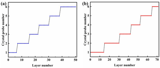 The first-order film layer sensitivity and second-order film layer sensitivity of the resonant cavity film A are shown in Figure 8a,b. The crystal switching position is set according to the film layer thickness and film layer sensitivity. When preparing resonant cavity film A, six quartz crystal control chips were used to monitor 1~6, 7~15, 16~23, 24~30, 31~38, and 39~50 layers, respectively. The quartz crystal control chip monitoring scheme of the resonant cavity film A is shown in Figure 9a.
