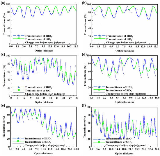 Combined with the sensitivity analysis of the resonant cavity film A, when the number of optical control pieces was lower than 3, it was impossible to find a monitoring scheme where the error of each layer can be controlled at 1%. Therefore, the number of optical control pieces in the monitoring scheme was determined to be 3. The 1# optical control chip monitored the 1st to 14th layers, 2# optical control chip monitored the 15th to 26th layers, and 3# optical control chip monitored the 27th to 50th layers. The monitoring wavelengths of the optical control chips were 435 nm, 443 nm, and 486 nm, respectively. The optical signal changing with thickness is shown in Figure 10a–c.