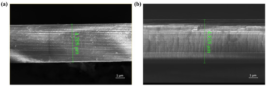 The cross-sectional morphology of resonant cavity film A and film B was tested by ultra-high-resolution field-emission scanning electron microscopy (SEM). The SEM results are shown in Figure 11. It can be observed that both the resonant cavity film A and resonant cavity film B have densely arranged lamellar structures. The physical thickness of the resonant cavity film A is 4.209 μm, and the relative error with the theoretical physical thickness is 0.24%. The physical thickness of the resonant cavity film B is 4.838 μm, and the relative error with the theoretical design physical thickness is 0.18%.