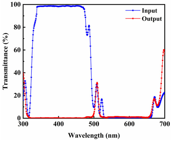 The transmittance of the input and the output mirror after the deposition of the antireflective films is shown in Figure 12. The results show that the average transmittance of the input mirror in the 345~460 nm band is 98.61% and the average reflectance in the 540~620 nm band is 99.61%. The average reflectance of the output mirror in the 345~460 nm band is 99.74%, and the average transmittance in the 540~620 nm band is 1.06%. The actual spectrum results meet the theoretical design requirements.