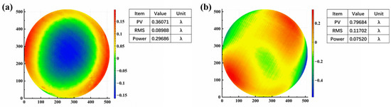 After the input and output mirrors of the resonant cavity were completed with the film preparation, surface shape tests were performed as shown in Figure 13. The measured PV values for the input mirror and output mirror were 0.36071λ and 0.79648λ, respectively, and the RMS values were 0.08988λ and 0.11702λ, respectively. Compared with the HfO2 single-layer film, the resonant cavity film prepared based on both HfO2 and UV-SiO2 materials has an increased number of layers, and the residual stress between the film layers will be larger. As a result, the microscopic morphology of the multilayer film is more inhomogeneous compared with the monolayer film, and the deformation and surface roughness will be higher than that of the monolayer film. Nevertheless, the PV and RMS values meet the requirements.