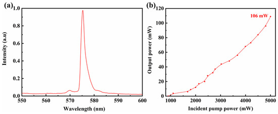(a) 575 nm laser output test diagram obtained under 450 nm laser excitation. (b) Laser output power test diagram with 106 mW.