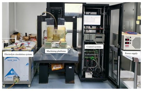 The electrolyte circulation system consists of circulation tubes, pressure control valves, pressure gauges, and reservoirs, and is an important part of the laboratory processing equipment. The high-voltage pulse power supply has excellent characteristics, such as reliable precision and outstanding stability. Under the control of human–machine interaction, the motion platform can move along the x, y, and z axes to complete the precise machining of the workpiece. At the same time, fluctuations in current and voltage during online processing can be monitored in real time with a digital oscilloscope.