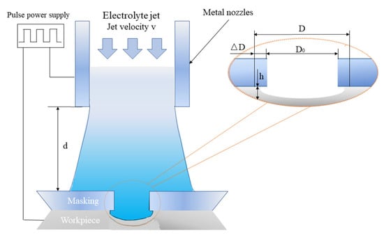 Jet electrolytic machining (Jet-ECM) is a special form of electrochemical machining (ECM) that uses an electrolytic jet as a tool. It offers advantages over other electrochemical machining processes such as good domain fixation, high machining speeds, and machining position flexibility [1,2]. The use of a displacement stage to drive the nozzle cathode to follow a pre-defined path enables rapid and precise fabrication of complex structures on the workpiece surface [3,4,5]. Hinduja and Pattavanitch [6] electrochemically machined a simple square pocket and a pocket with a humanoid protrusion, using tools with round and square electrodes. Hackert-Oschätzchen et al. [7] used a continuous electrolytic free jet to obtain a high degree of positioning in the removal area and electrochemically processed cavities with a depth of about 180 μm and a width of about 190 μm. Kawanaka and Kunieda [8] investigated the effect of current conditions and nozzle movement speed on the surface roughness of stainless steel, and achieved a mirror-like surface with Rz surface values of less than 0.2 μm. It was shown that the surface roughness of the cavities decreased as the nozzle translation speed increased, and that for constant speeds the surface roughness of the cavities decreased and increased again after reaching a minimum value [8,9,10].