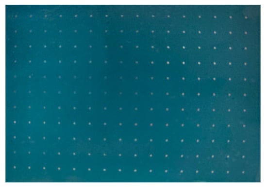 Figure 3a shows that discharge occurs inside the jet electrolytic flow injection and producing a superposition effect. Figure 3b shows that no discharge occurs in the jet and it is conventional electrolytic processing. Whether or not the discharge occurs, inevitably has a different effect on the machining effect. The experimental sample is the initial sample with low surface roughness (i.e., stainless steel workpiece), with the size specification of 70 × 50 × 1 mm3. To facilitate the measurement, the spacing between holes is set to be 4 mm, i.e., the distance between a and b is 4 mm, thus obtaining the machining dimensions of the mask as shown in Figure 4.