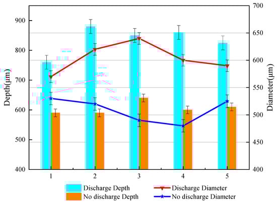 The experimental data for the depth H and width D of the holes (pits) are an important basis for the analysis of machining efficiency and quality. For ease of observation, the experimental data in Table 5 is plotted as a relationship, as shown in Figure 10.