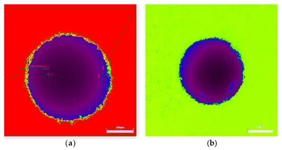 As can be seen from Figure 7, the shape of the single hole machined by the Jet-MECDM method is as regular as that of the single hole machined by the Jet-MECM method, and the inner wall of the single hole machined by both is equally smooth. To investigate the role of the mask as a constraint, the single hole with the mask was observed in 2D using a laser scanning confocal microscope, as shown in Figure 8.