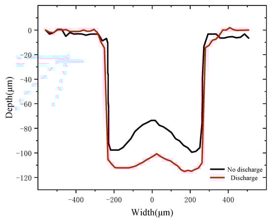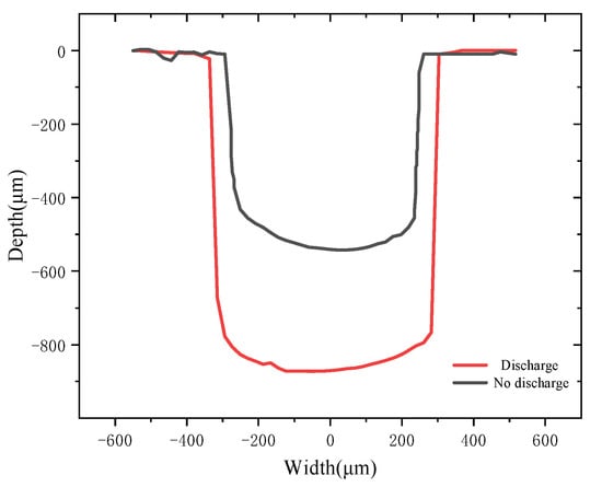 As can be seen in Figure 8, the Jet-MECDM does not have any significant damage to the mask due to the discharge effect, and the mask is well constrained. The comparison in Figure 8 also shows that the color of the bottom of the Jet-MECM hole is not consistent, indicating a large deviation in the bottom morphological profile. This is further confirmed by the side measurements of the hole cross-sections for both machining methods, as shown in Figure 9.