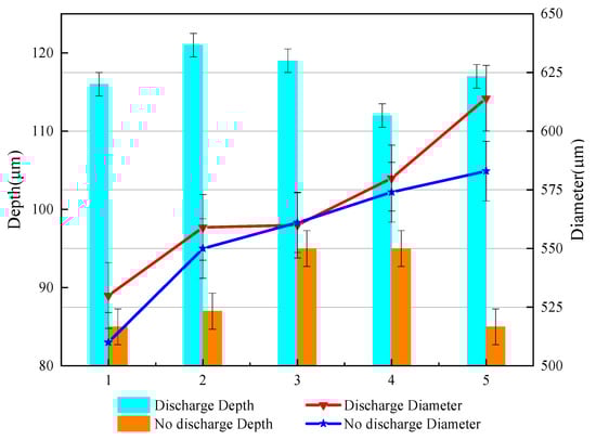 As shown in Figure 6, the primary longitudinal axis represents the depth of a single hole (pit), and H (depth), and is represented by a bar graph. The secondary longitudinal axis represents the width of the single hole (crater), and D (diameter), and is represented by a line graph.