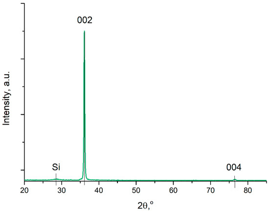 The phase composition, structure, and coherent scattering region (CSR) size of AlN films have been determined via X-ray diffraction. The diffraction patterns of the samples (Figure 1) show the narrow 002 and 004 reflections of the hexagonal AlN with interplanar distances of 2.497 and 1.244 Å according to the Bragg equation. The additional low intensity reflection belongs to the silicon wafer. The existence of these reflections as much as the absence of other AlN reflections, such as 101 or 103, allow us to confirm that the deposited AlN has a c-axis texture close to that of epitaxial films. CSR values calculated using the Scherrer formula were in the range of 60–65 nm for all samples, which evidences their highly crystallized structure. Thus, X-ray diffraction analysis exhibits the phase composition and texture of AlN films that are mostly favorable for piezoelectric applications [1].