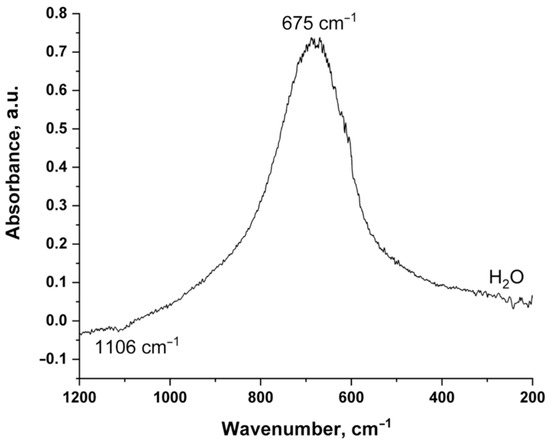 The IR absorption spectra of AlN films were recorded in the range of 1200–200 cm−1; a band is observed with a maximum at about 675 cm−1 (Figure 2), which is related to E1(TO) phonon band of hexagonal AlN [25,41,42,43]. The predominance of this band indicates the preferential orientation of the film crystallites in the c-axis direction [43], which is in agreement with XRD results. The feature at 1106 cm−1 is a consequence of the incomplete compensation of the spectrum on an uncoated substrate, and corresponds to interstitial oxygen, which always presents in silicon [44]. In the low-frequency region of the spectrum (300–200 cm−1), weak rotational bands of atmospheric water are observed, since the spectrometer cuvette was not purged with dry gas during the studies.