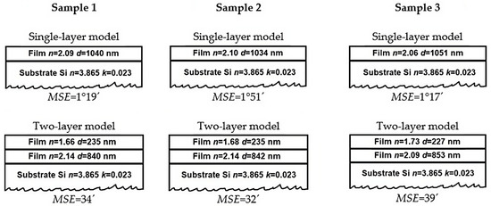 where N is the number of angles of light incidence on the sample (N = 5); ψie and Δie are the experimental values of the ellipsometric angles at the i–th angle of incidence; ψic and Δic are the values calculated for the given model. IPE was solved using one-layer and two-layer models.