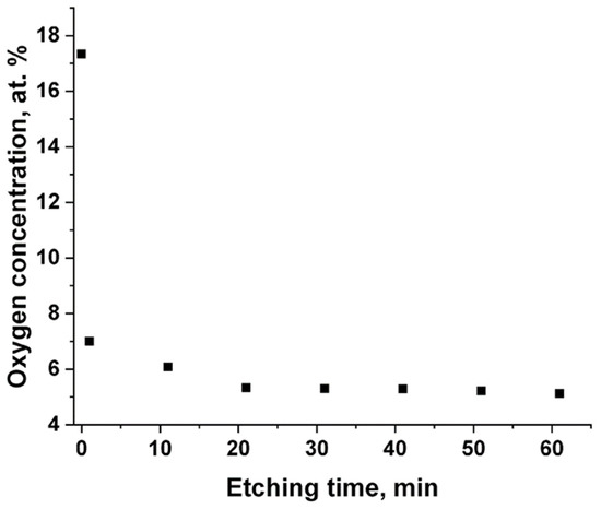 The depth profiles of the atomic concentrations were obtained using an X-ray photoelectron spectrometer (XPS) FlexPS (SPECS Surface Nano Analysis GmbH, Berlin, Germany) equipped with a Phoibos 150 analyzer (SPECS Surface Nano Analysis GmbH., Berlin, Germany) with a 1D–DLD electron detector (SPECS Surface Nano Analysis GmbH., Berlin, Germany). The XPS spectra were recorded using a monochromatic Al Kα (λ = 8.3386 Å) source. Film etching was carried out with a scanning Ar+ ion beam over an etching area of 5 mm × 5 mm. The ion current was 48 μA. The XPS spectra of the films were recorded before etching, 1 min after the etching start and then every 10 min, while the overall etching time was 61 min. Atomic concentrations were calculated from the spectra area after subtracting the background of the inelastically scattered electrons. The photoionization cross section, electron free path, and instrumental function of the spectrometer were also considered for correct determination of the composition. After XPS studies, the cross-section SEM images of the films were obtained at two areas, i.e., at the center of the etching area and outside the etching area.