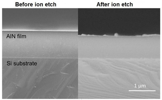 SEM cross-sectional view of AlN/Si(111) sample before and after ion etching in the XPS chamber. Film–substrate interfaces are intentionally matched for clarity.